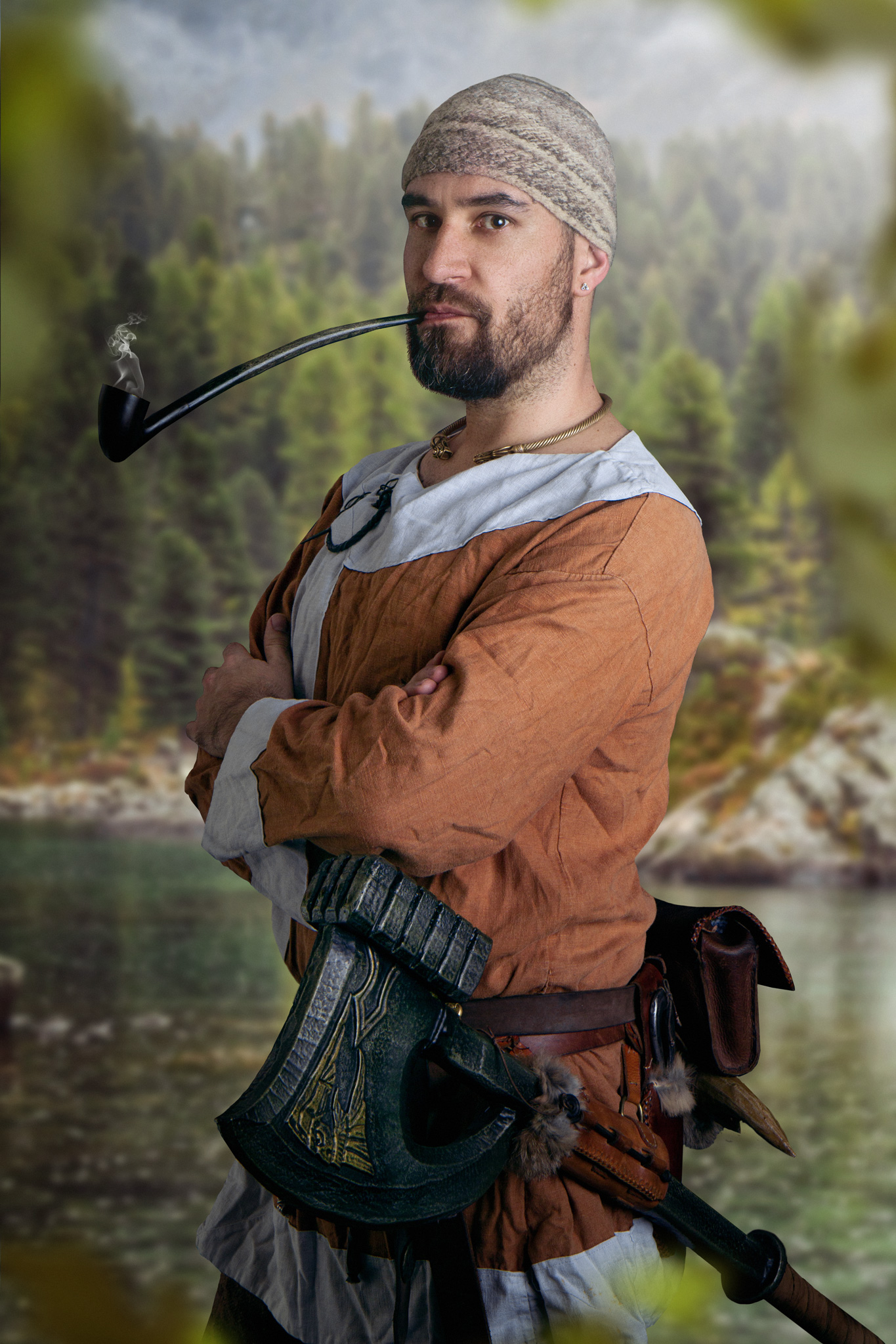 Der Mann aus dem Norden zog lange umher, in seiner Jugend erlernte er das Schmiedehandwerk von einem zwergischen Schmiedemeister. Er erkannte aber mit der Zeit, dass zu einen Lebzeiten nie auch nur annähernd an die Schmiedekunst eines Zwergen heranreichen würde, daher zog er als wandernder Geselle hinaus in die weite Welt. Doch die Geldnot zwang ihn mehr oder minder in das Handwerk eines Söldners hinein. Seine Liebe zur Schmiedeesse sollte aber nie erlöschen. Das meiste seines Soldes legte er zur Seite, um sich seine fahrende Esse leisten zu können. Seitdem steht er wieder am Amboss, doch wird er im Kampf gebraucht, so wirft er sich sein Kettenhemd über, schnappt sich seinen Hammer und steht wieder Seite an Seite mit seinen Gefährten in der Schlachtreihe.